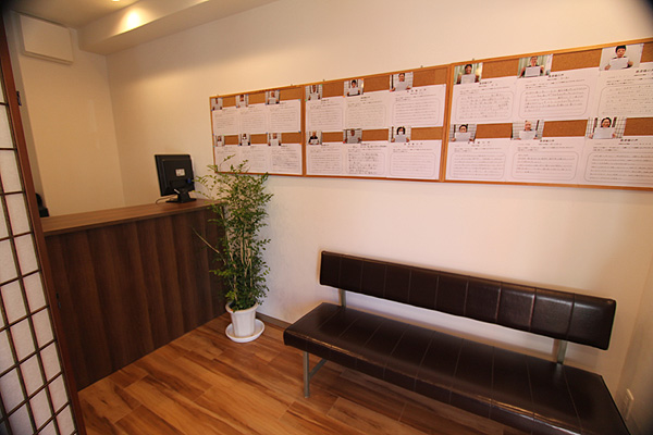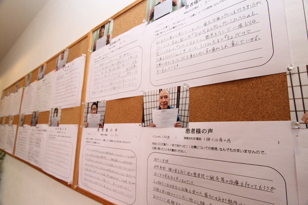 待合室には今まで私の治療を受けた患者様の声を載せてあります。当ホームページでも確認できますので是非ご覧ください。