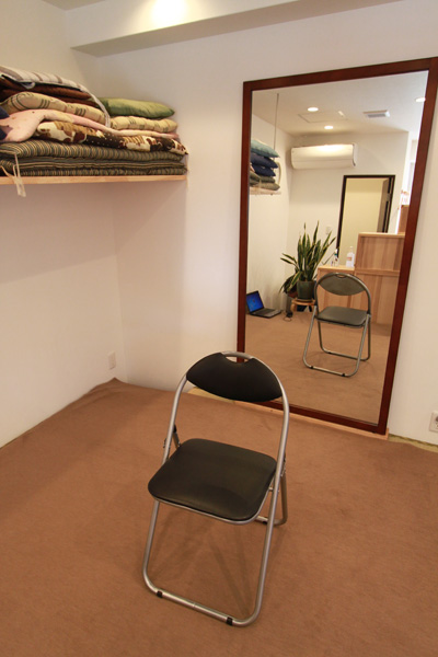 当院の施術室です。当院の施術には機械類は一切必要としません。患者様一人一人に合わせた運動療法を行っていますので、その患者様が一番楽な体勢を座布団を使ってその場で作っています。